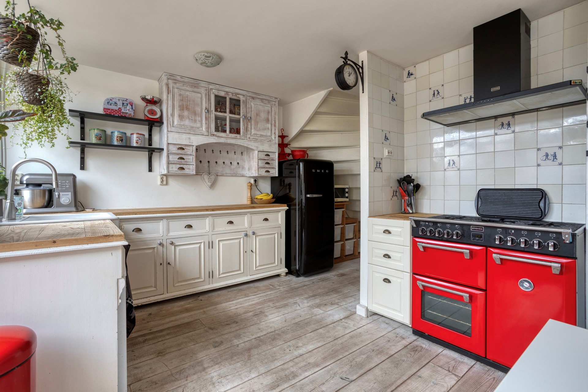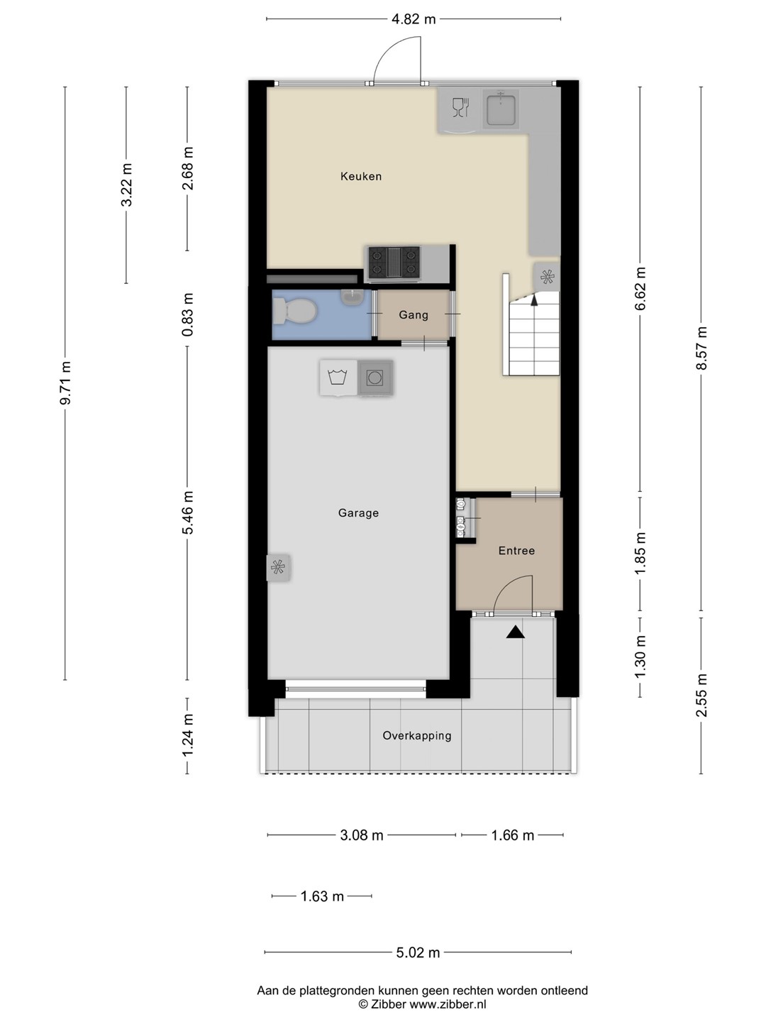 Begane grond: - Entree woning, voorportaal met meterkast, open trapopgang, toegang tot de garage, toilet met fontein en de keuken welke zich aan de tuinzijde bevindt met terrasdeur naar de tuin. De gezellige keuken is geheel naar wens in te delen met bijvoorbeeld een losse koelkast, vaatwasser en heeft voldoende ruimte voor een groot fornuis en een lange eettafel. De garage beschikt over een elektrische garagedeur, was en droog aansluiting, kraan en extra elektriciteitsaansluiting voor bijvoorbeeld een vriezer.