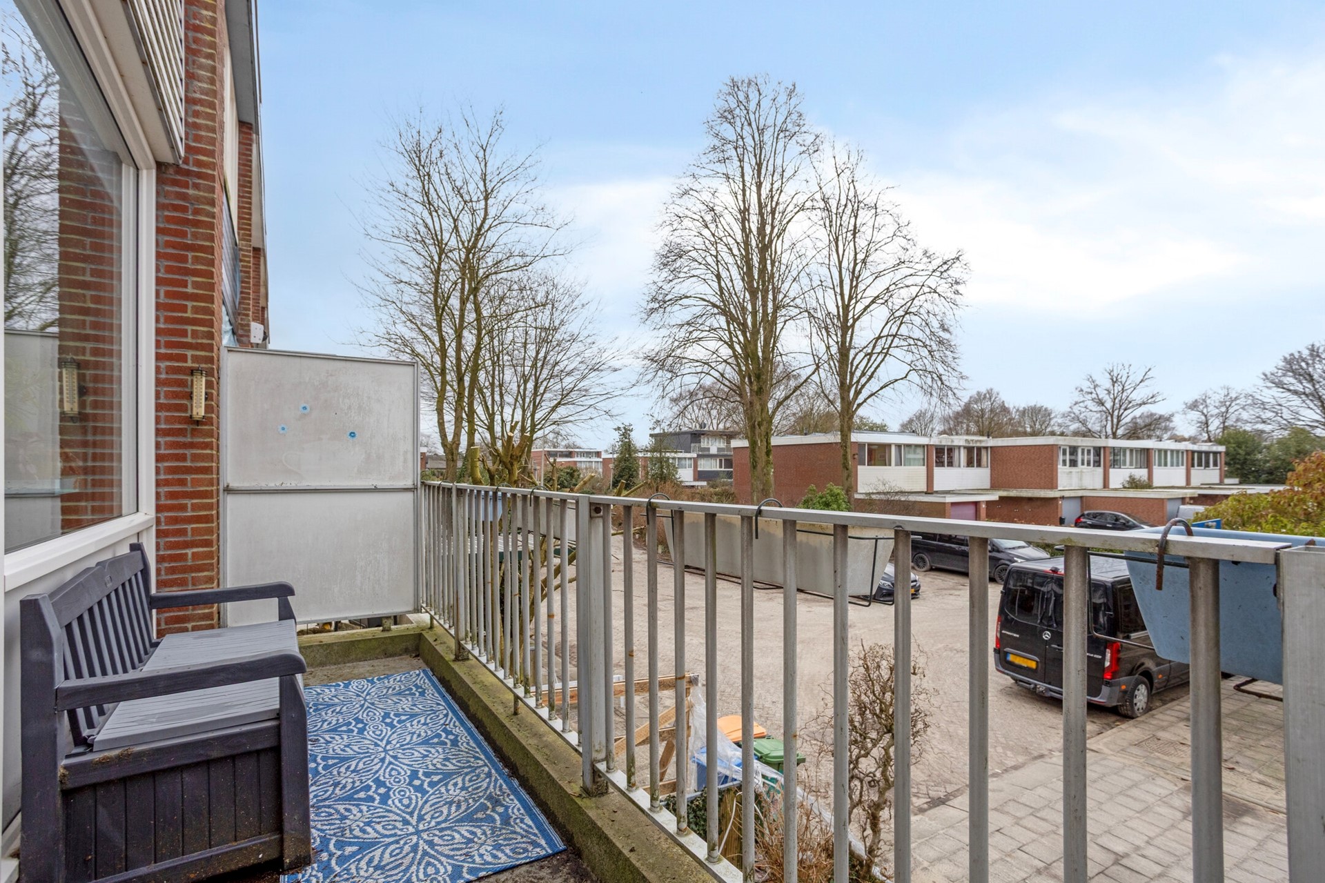 - vrij uitzicht op de straat vanaf het zonnige balkon met uitvalscherm